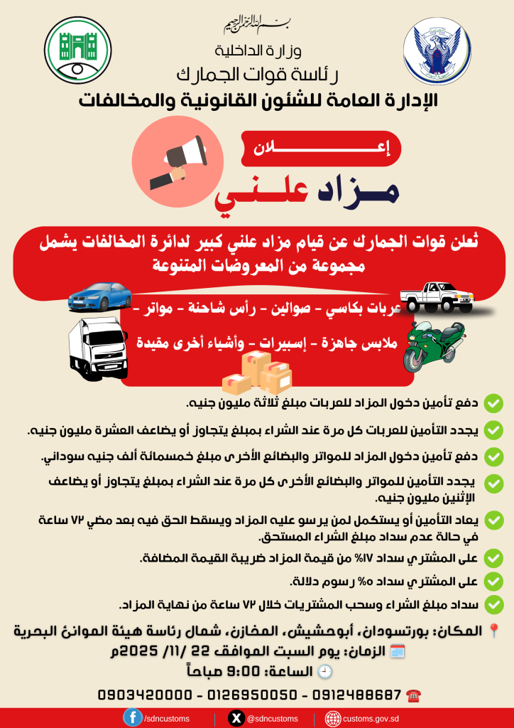 تُعلن الإدارة العامة للشؤون القانونية والمخالفات بقوات الجمارك عن قيام مزاد علني كبير لدائرة المخالفات، يشمل:
